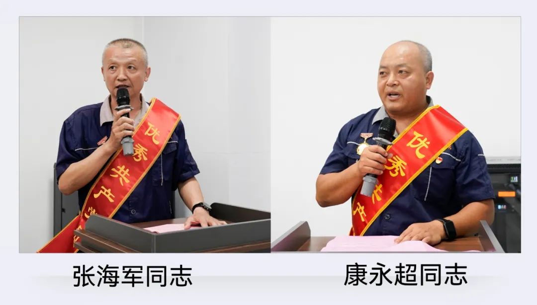 機(jī)工裝配車間黨支部書記張海軍同志作為先進(jìn)基層黨組織代表作了表態(tài)發(fā)言;營銷中心黨支部康永超同志作為優(yōu)秀黨員代表作了表態(tài)發(fā)言。